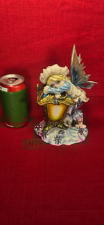 Cette fée élégante est vêtue d'une robe bleue royale, ornée de bijoux assortis aux bras, et coiffée d'un chignon.