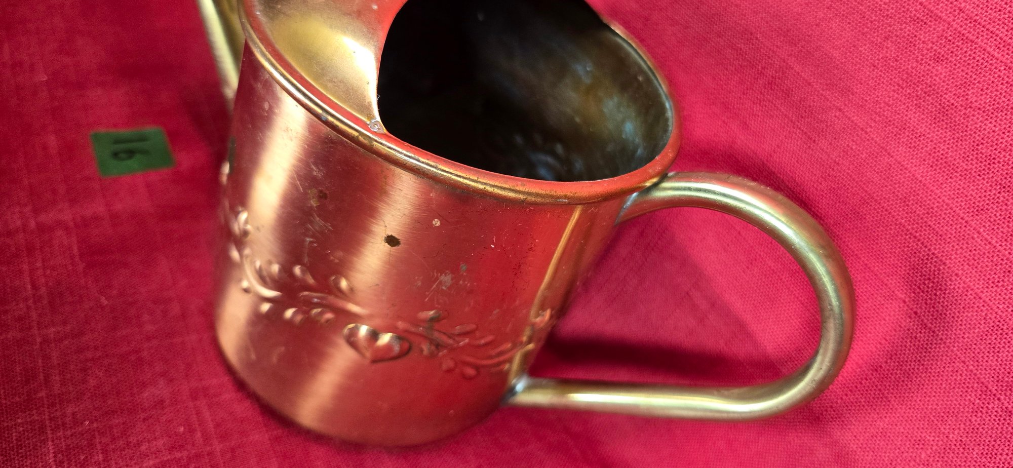 Fabriqué en laiton mesurant environ 5 pouces de haut au point le plus élevé x environ 91/2 pouces de large d'un côté à l'autre avec le bas mesurant 4 pouces x 4 pouces. L'intérieur mesure 4 pouces de profondeur. Une fois rempli d'eau, il contient environ 2 tasses ou 16 onces. A un motif floral.