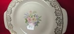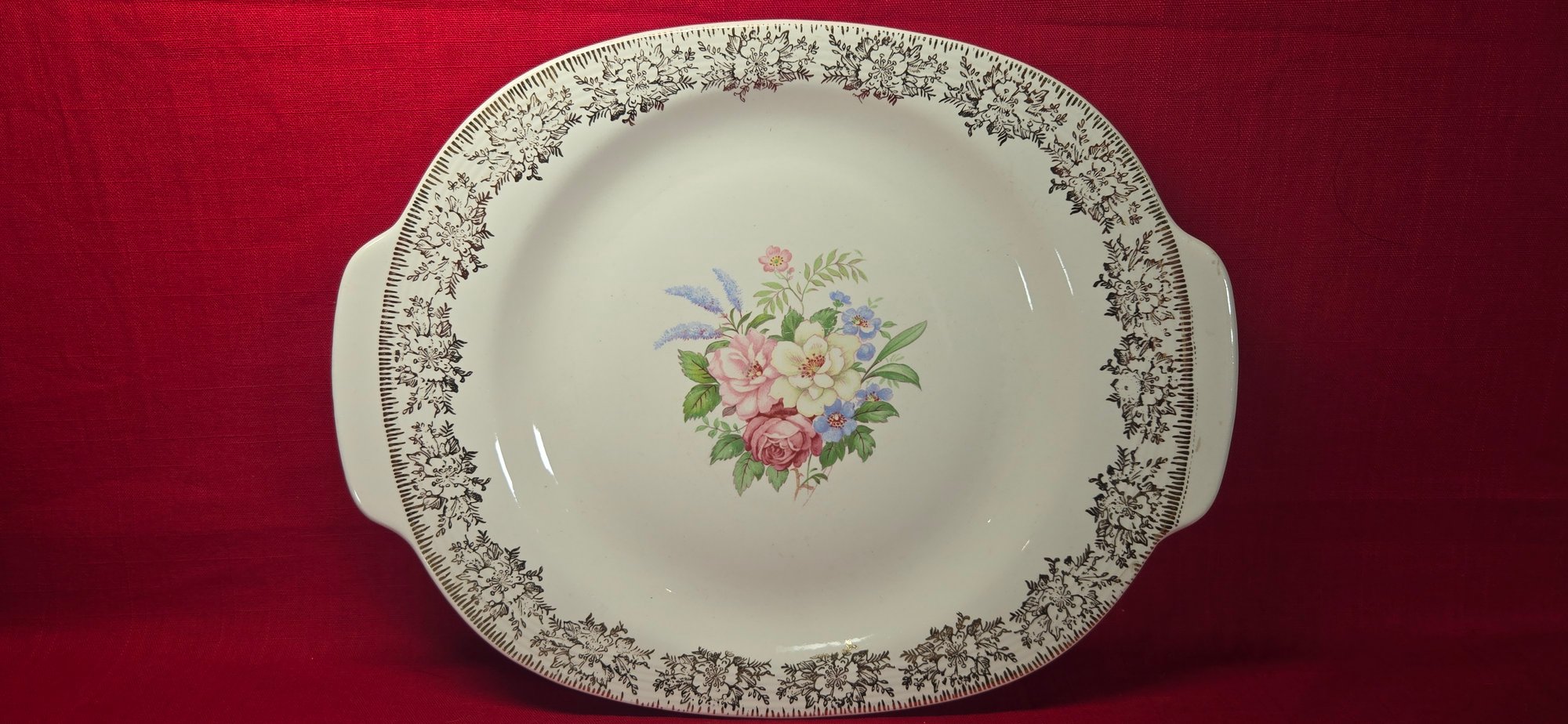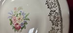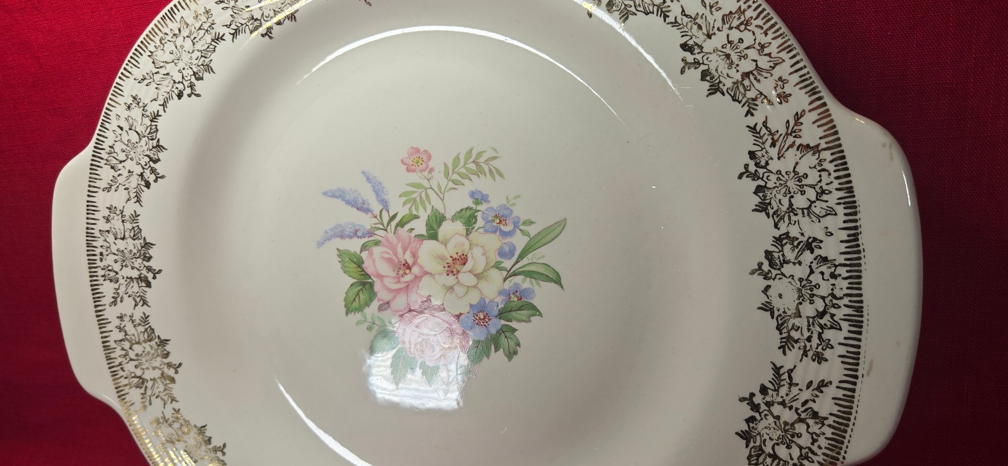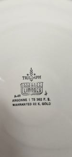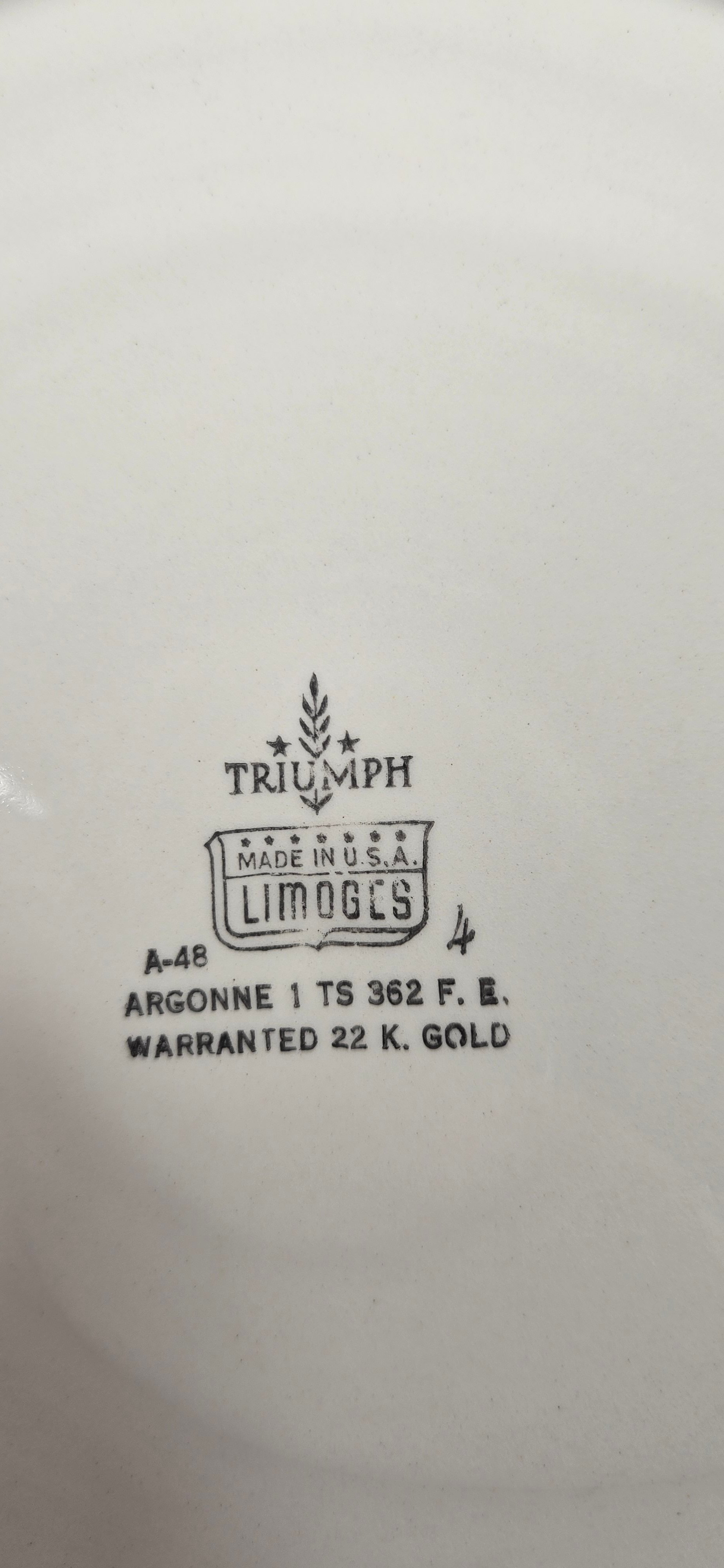 La ligne Triumph des années 1940 est le motif Rosalie de Limoges USA. De la collection de vaisselle festonnée avec une bordure en filigrane d’or 22 carats et un spray floral rose central.